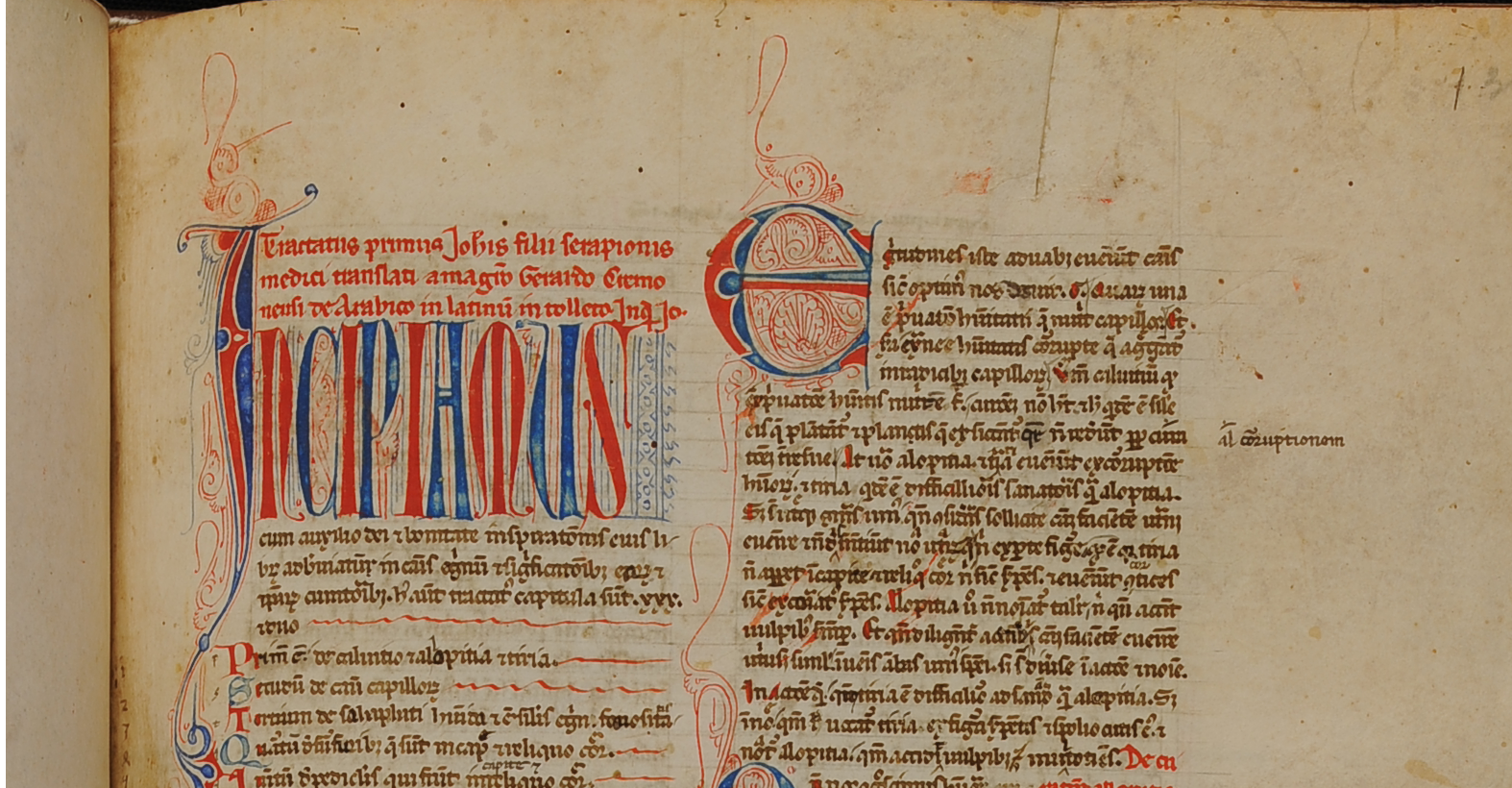 Il volume racchiude una serie di testi di medicina tra i quali spiccano il Liber Serapionis o De simplici medicina, del medico arabo-cristiano Serapione il giovane, e il Diete Universales, di Isaac Israeli ben Solomon medico e filosofo egiziano di cultura ebraica. Il codice, realizzato in elegante scrittura gotica da diverse mani, presenta una prima parte decorata con iniziali filigranate alternate rosso e blu, alcune di dimensioni maggiori (c.130r).