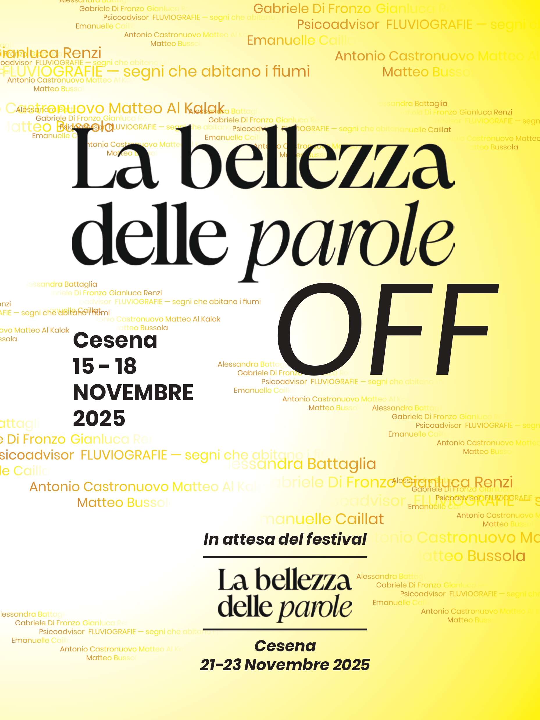 Il festival La Bellezza delle Parole, in programma a Cesena dal 21 al 23 Novembre, è preceduto da una sezione OFF organizzata dal Comune di Ceesna e dalla Biblioteca Malatestiana, in collaborazione con Libreria Albizzi, Librerie Coop Cesena, Giunti al Punto Cesena, I Libri di Elena, Mondadori Bookstore, Libreria Ubik Cesena, Viale dei Ciliegi 17 e Associazione Barbablù.