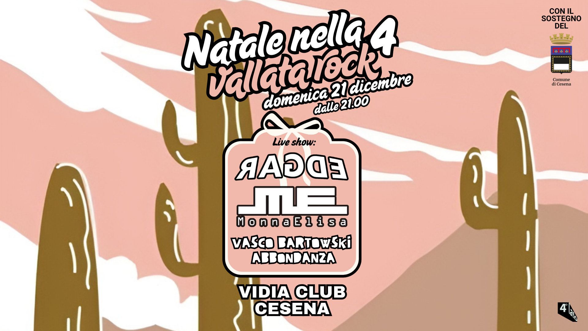 Sabato 21 dicembre dalle 20 al Vidia Rock Club si terrà la serata NATALE NELLA VALLATA ROCK 4, organizzato dall'Associazione 4Lato con il sostegno del Comune di Cesena