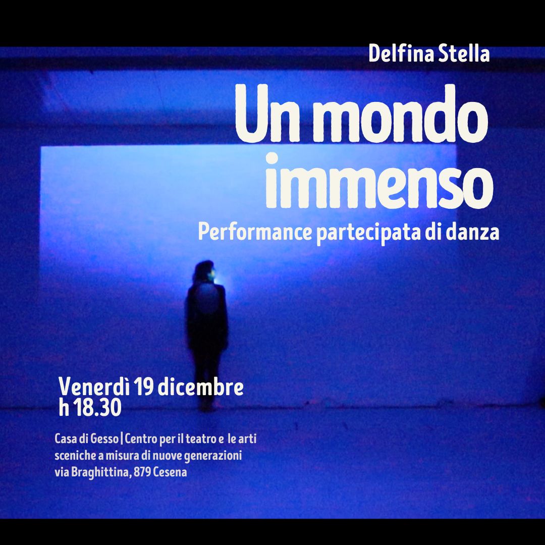 Venerdì 19 dicembre ore 18.30 presso la sede di Casa di Gesso, andrà in scena "Un mondo Immenso", performance partecipata di danza, esito del progetto Preludio - luogo di dialogo e residenza creativa.In scena i bambini e le bambine della scuola di teatro e arti sceniche di Casa di Gesso coinvolti nella residenza creativa come protagonisti attivi del processo, contribuendo alla co-creazione di dispositivi partecipativi che intrecciano danza, musica e video.