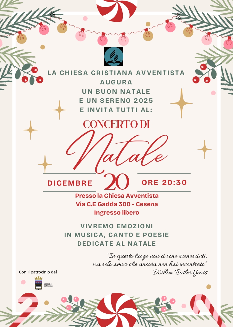 Sabato 20 dicembre, alle ore 20.30, la Chiesa Avventista di Cesena invita tutta la cittadinanza al Concerto di Natale, una serata speciale pensata per vivere assieme l’atmosfera unica del Natale, attraverso musica, canto e poesie per condividere un momento di gioia, riflessione e serenità.