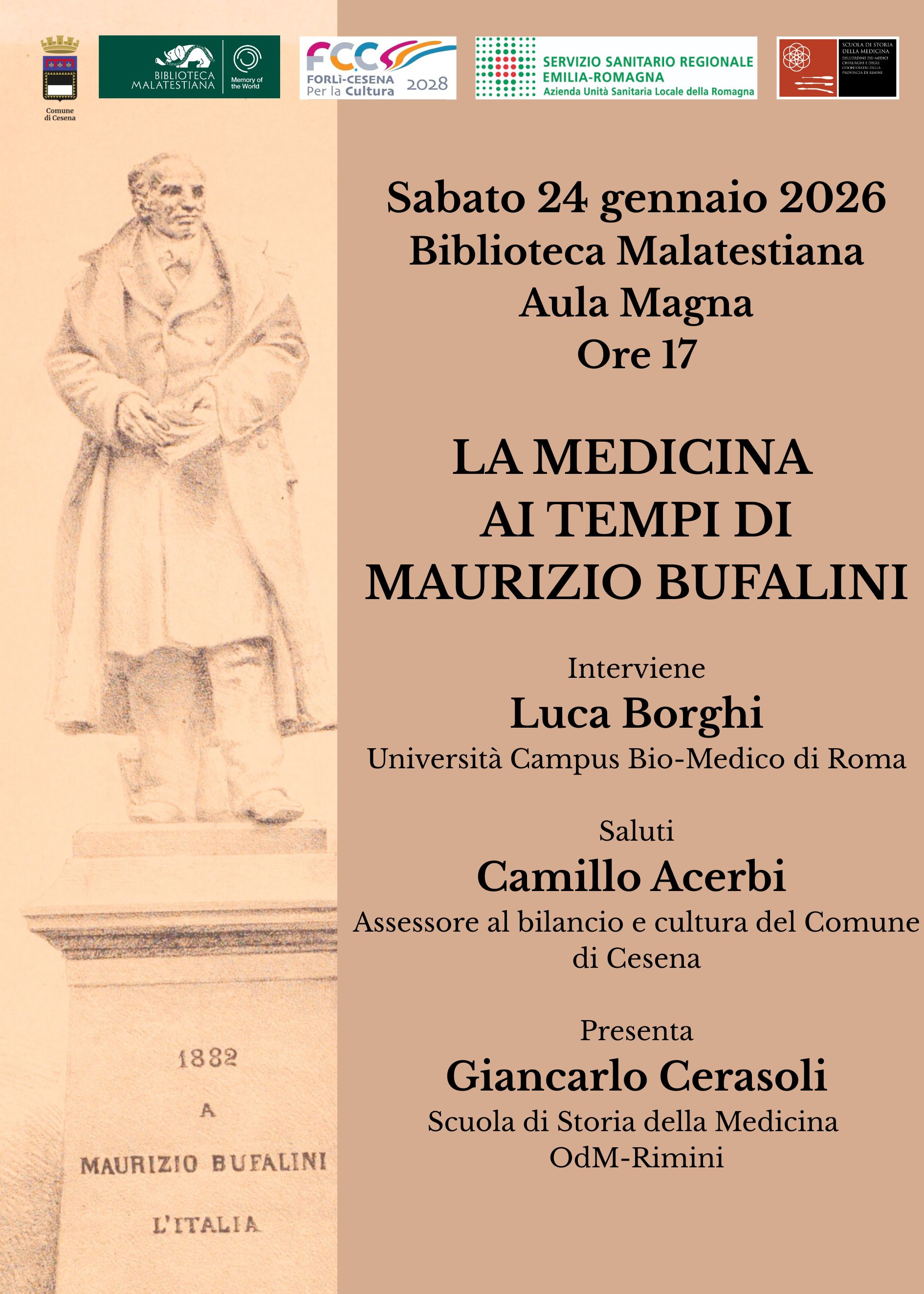 La conferenza si inserisce nel programma delle celebrazioni bufaliniane, a 150 anni dalla morte del medico cesenate (1875-2025), avviate con il convegno di sabato 22 novembre 2025 e con la mostra, tuttora in corso presso la sala Piana della Biblioteca Malatestiana dal titolo "L'occhio clinico. Maurizio Bufalini e i suoi libri".
