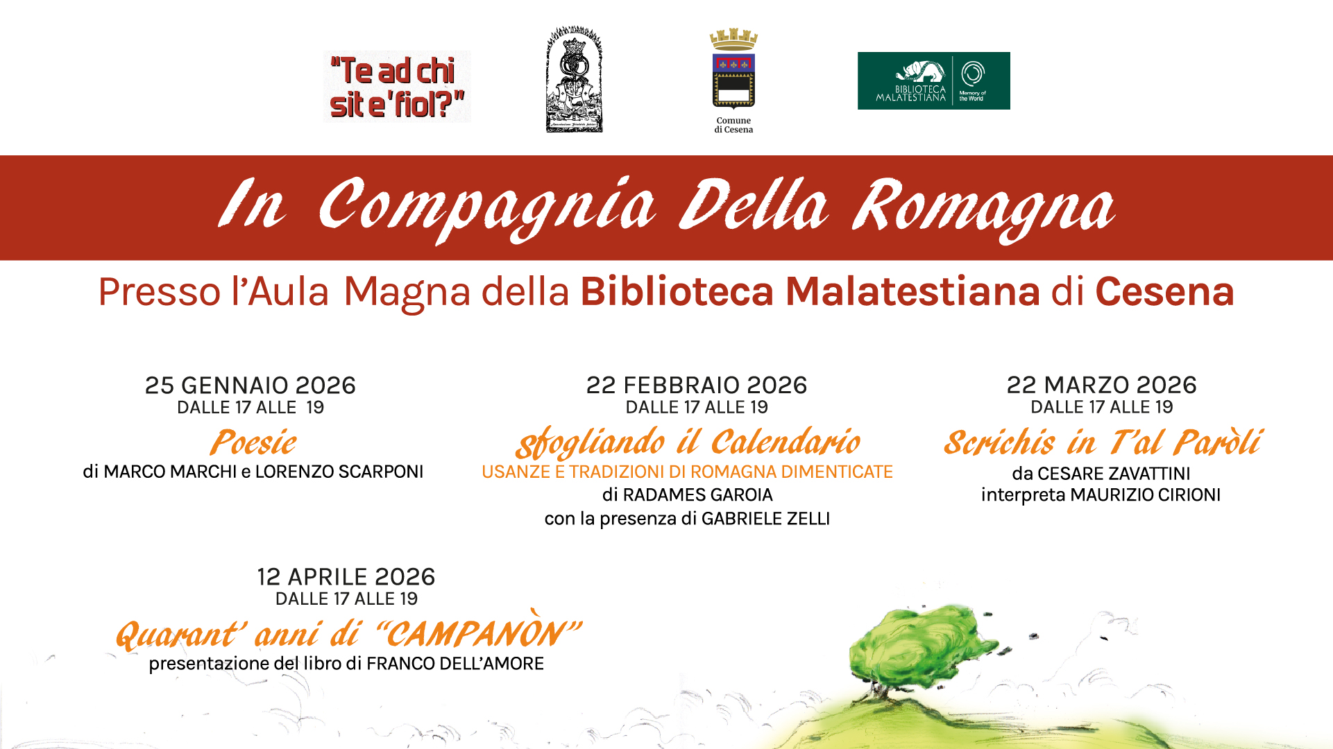 Ritorna anche per il 2026 il ciclo di conferenze "In compagnia della Romagna" dedicate al dialetto romagnolo, frutto della collaborazione tra Ass. Te ad chi sit e fiol, Istituto "Friedrich Schürr" e Biblioteca Malatestiana