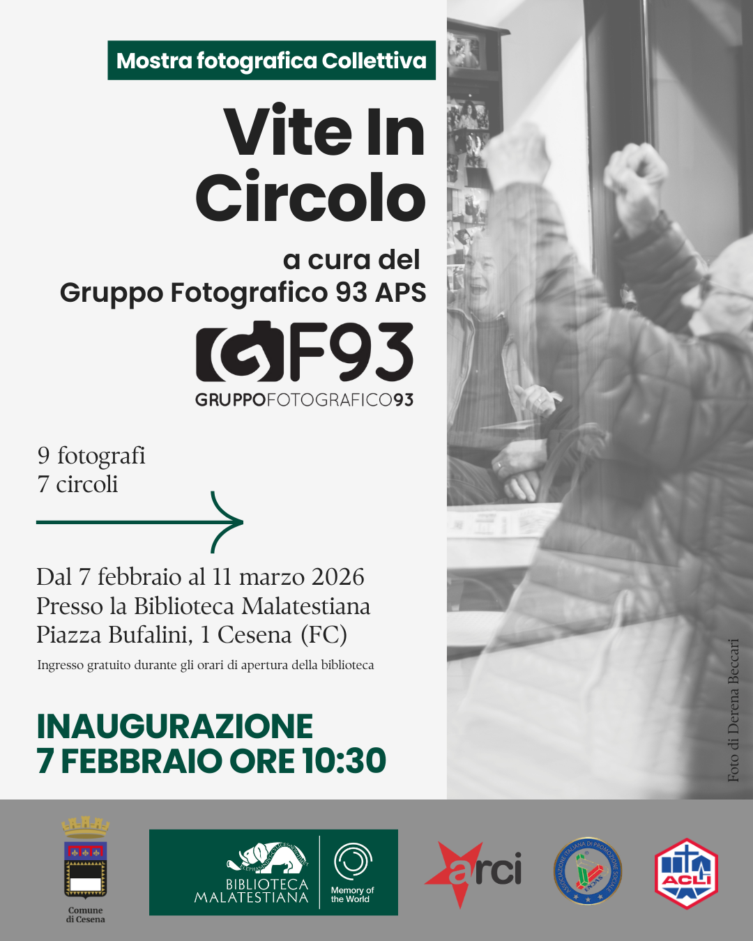Sabato 7 febbraio 2026 alle ore 10.30, presso l’Aula Magna della Biblioteca Malatestiana, verrà inaugurata la mostra fotografica Vite in Circolo, un progetto espositivo che racconta, attraverso le immagini, la vita e il valore sociale dei circoli ACLI, ARCI ed ENDAS della provincia di Forlì-Cesena.