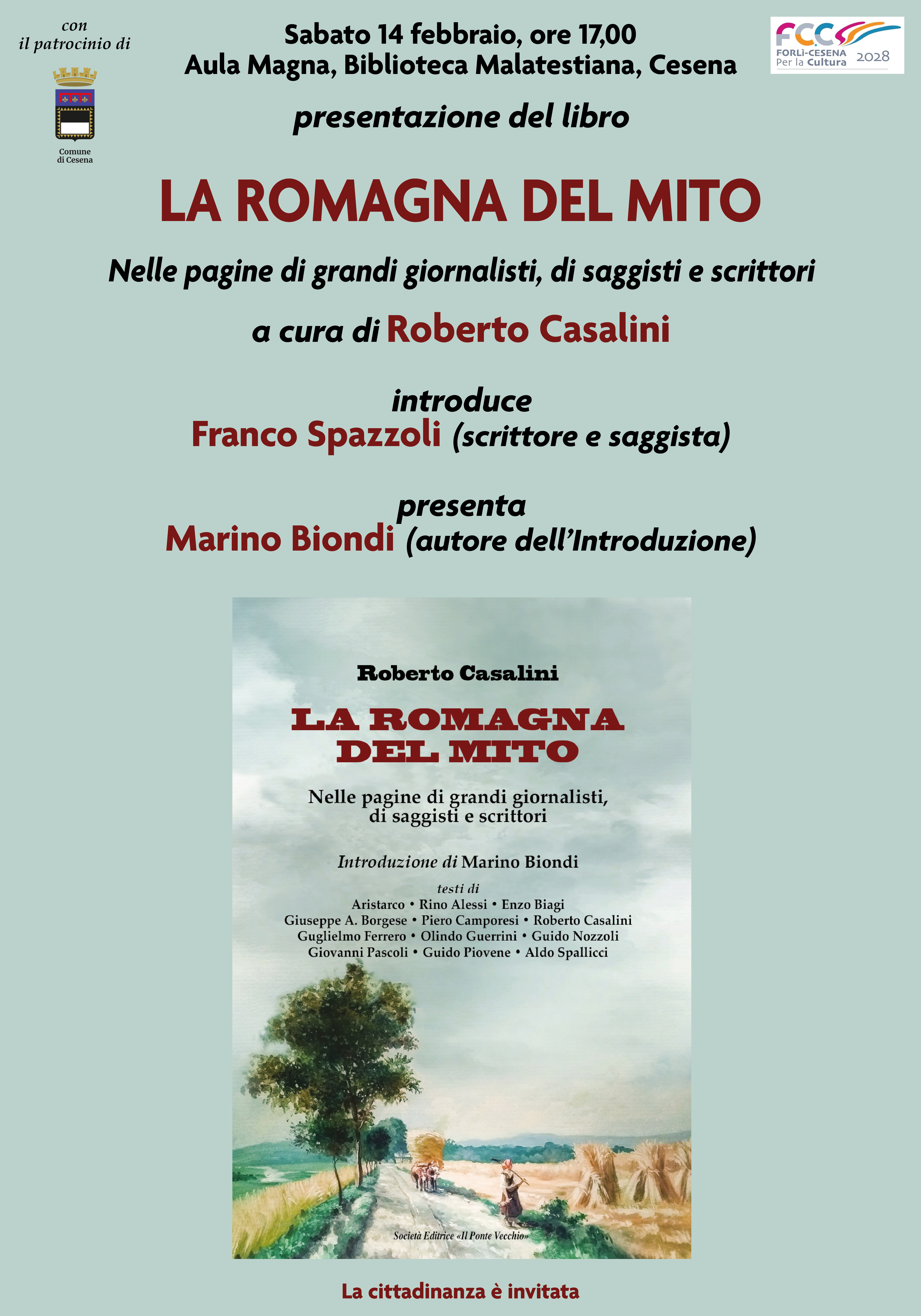 Sabato 14 febbraio alle ore 17.00, presso l'Aula Magna della Biblioteca Malatestiana, si terrà la presentazione del libro "La Romagna del mito - Nelle pagine di grandi giornalisti, di saggisti e scrittori" a cura di Roberto Casalini.