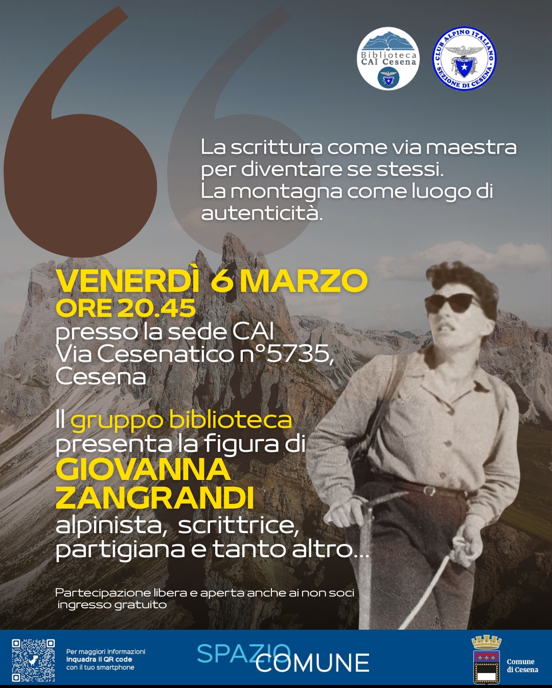 Venerdì 6 marzo alle ore 20.45, nello Spazio Comune "I Maceri", CAI Cesena presenta la figura di Giovanna Zangrandi, alpinista, scrittrice, partigiana.