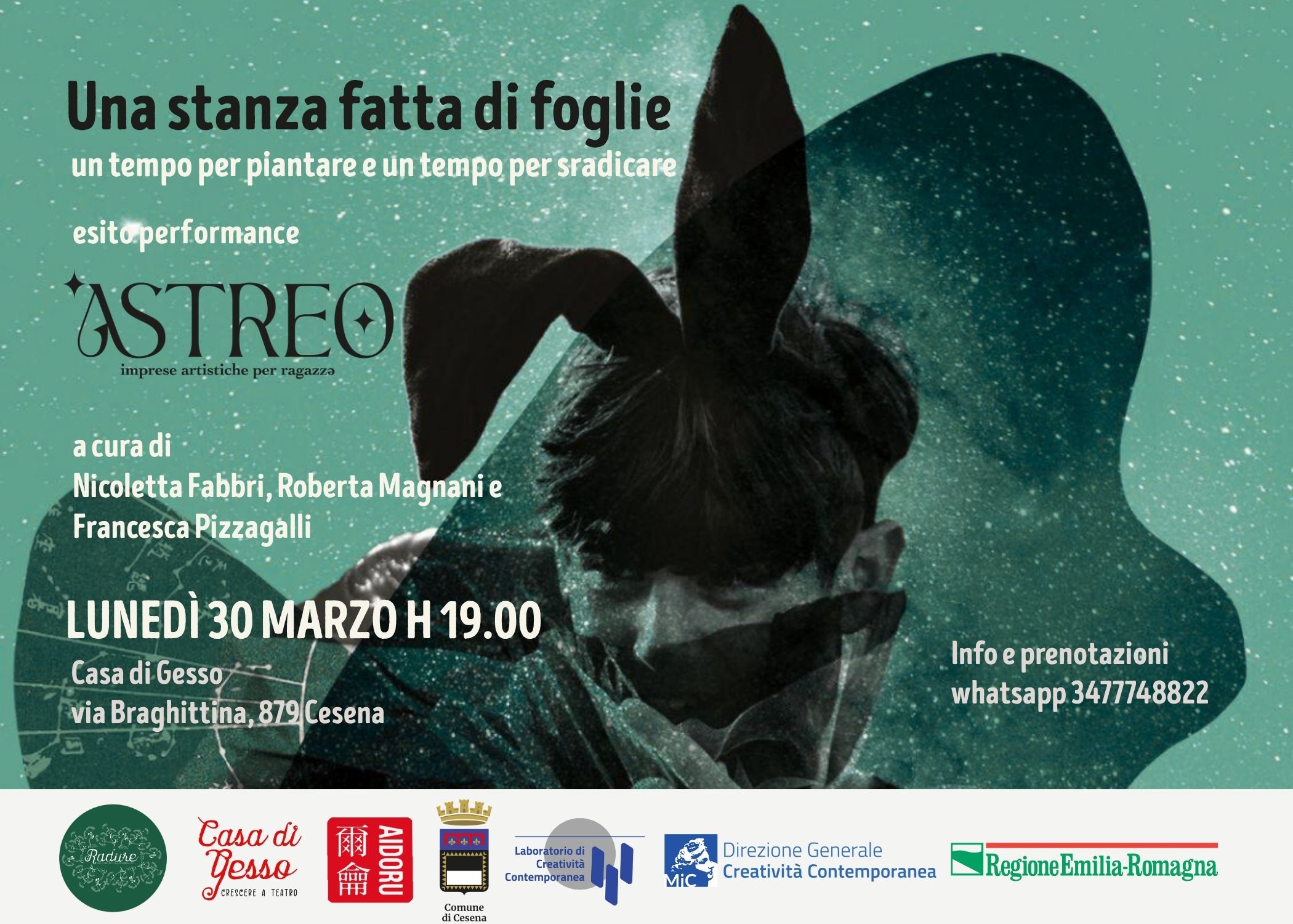 Lunedì 30 marzo alle 19.00, Casa di Gesso presenta l’esito pubblico del quinto modulo di "Astreo. Imprese artistiche per ragazze e ragazzi dai 13 ai 19 anni", un percorso di arti performative, teatro, drammaturgia, danza, canto, scenotecnica e feste curato da Casa di Gesso/Aidoru Associazione Aps all’interno del percorso "Radure. Spazi e pratiche per nuove generazioni" sostenuto dal Laboratorio di Creatività Contemporanea promosso dalla Direzione Generale Creatività Contemporanea del Ministero della Cultura in partenariato con il Comune di Cesena.