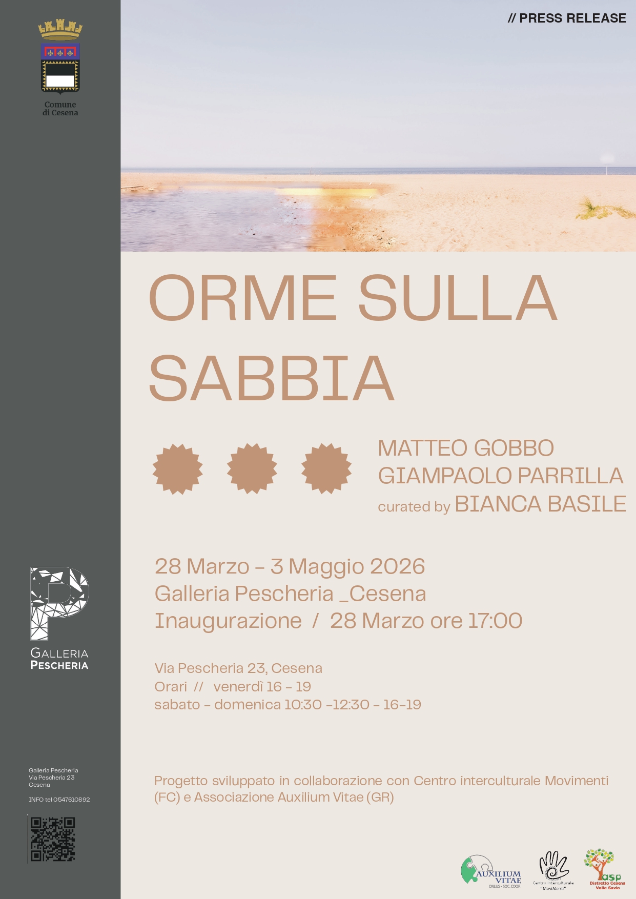 Sabato 28 marzo alle 17 in Galleria Pescheria sarà inaugurata la mostra Orme sulla sabbia, degli artisti Giampaolo Parrilla e Matteo Gobbo, curata da Bianca Basile